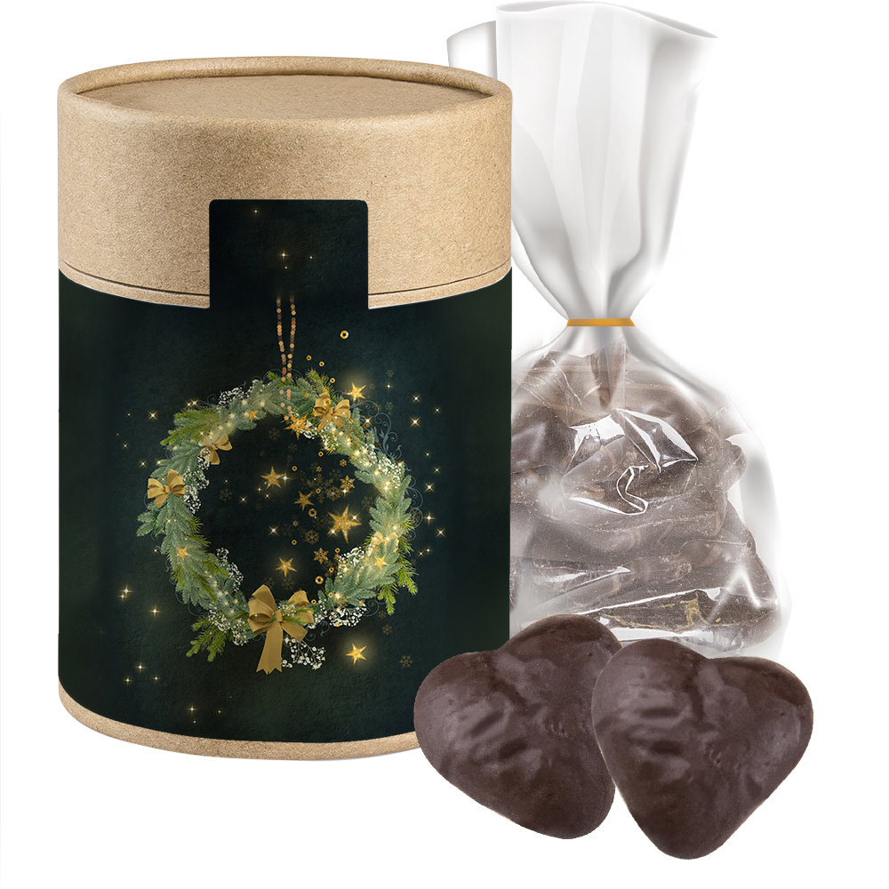 Lebkuchen Schokoherzen gefüllt, ca. 100g, Beutel in Kraftpapierdose Maxi