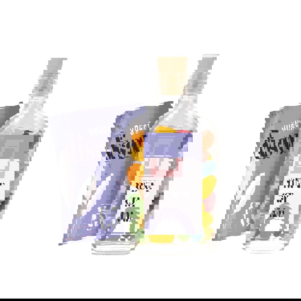 Flaschenpost mit 4c-Euroskala Aufkleber, mit bedrucktem und gerolltem Brief mit ca. 75 Gramm Jelly Beans
