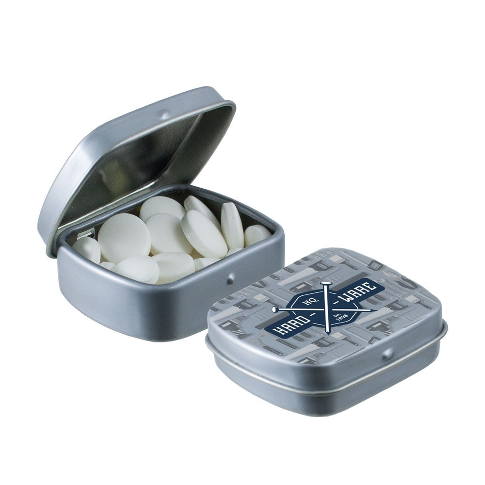 Mikro Klappdeckeldose weiß mit ca. 9 Gramm Pfefferminz, 4c-Euroskala bedruckt, mit Zutatenaufkleber und eingeschweißt