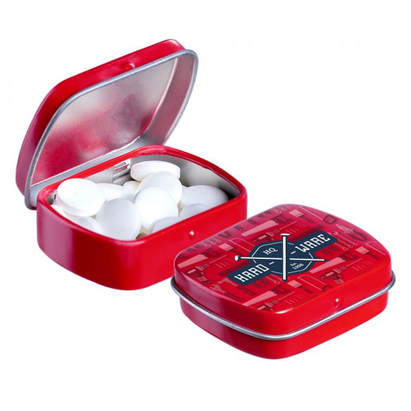 Mikro Klappdeckeldose weiß mit ca. 9 Gramm Pfefferminz, 4c-Euroskala bedruckt, mit Zutatenaufkleber und eingeschweißt