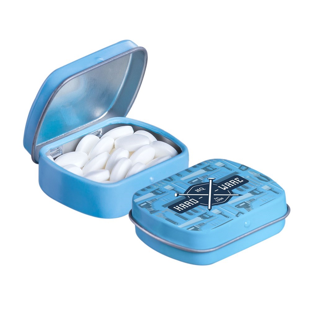 Mikro Klappdeckeldose weiß mit ca. 9 Gramm Pfefferminz, 4c-Euroskala bedruckt, mit Zutatenaufkleber und eingeschweißt