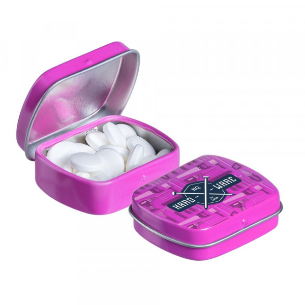 Mikro Klappdeckeldose weiß mit ca. 9 Gramm Pfefferminz, 4c-Euroskala bedruckt, mit Zutatenaufkleber und eingeschweißt