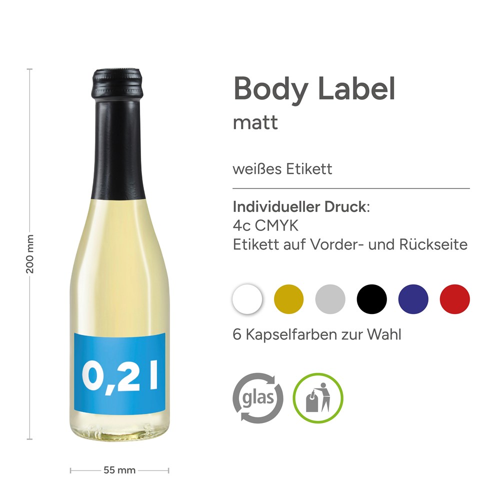 Dekoration: Body Label matt, edelmattes Etikett auf Vorder- und Rückseite der Flasche. Druck: 4c (CMYK)