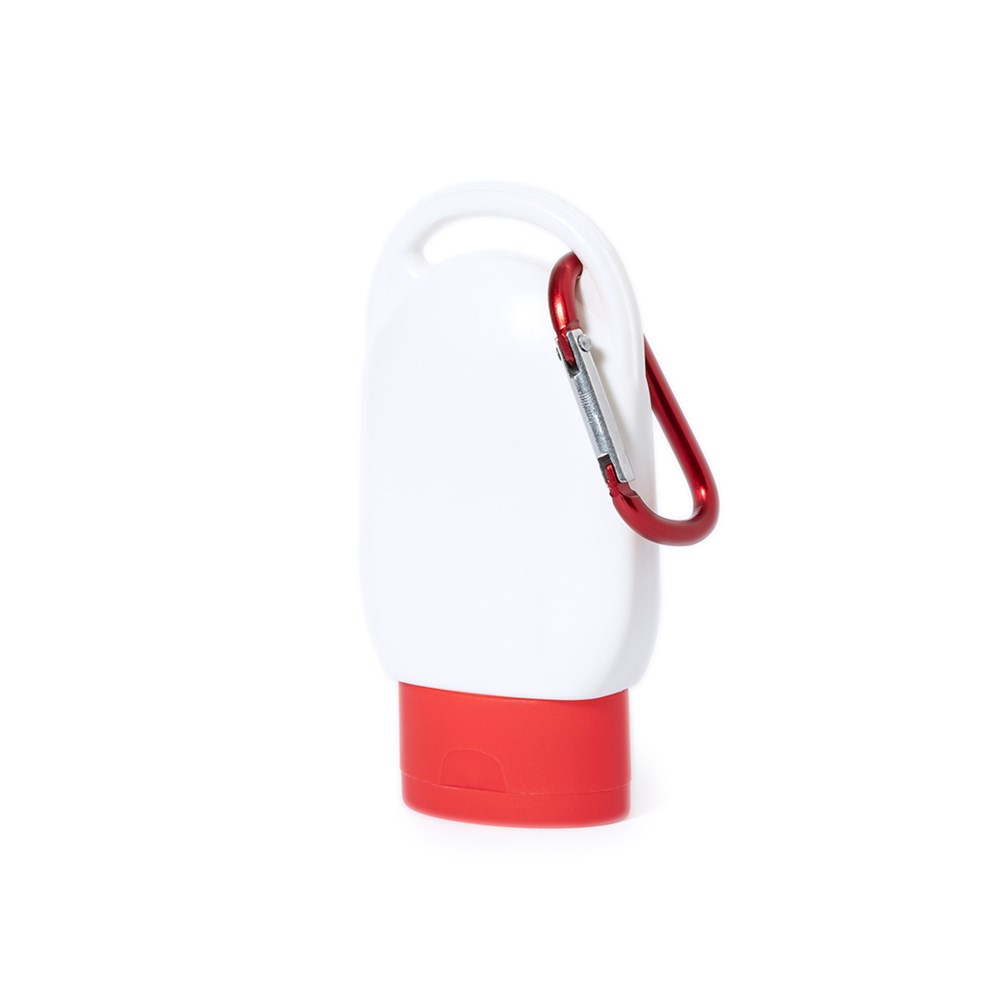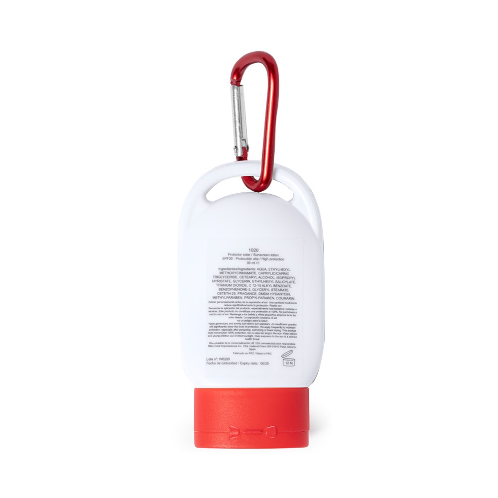 Sonnenschutzcreme Faktor 30. Präsentiert in einer praktischen 30ml-Flasche und mattierter Oberfläche. In vielen Farben erhältlich, mit passendem Transportkarabiner.