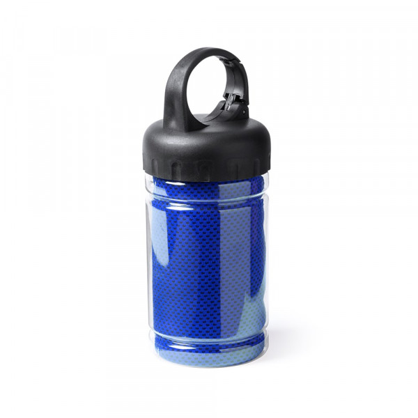 Handtuch mit den Maßen 90 x 30 cm aus kühlendem SoftCool-Extreme-Material (160 g/m2) mit UV-50-Schutz. Präsentiert in einem transparenten Gehäuse mit Deckel und Tragegriff sowie integrierten Befestigungskarabiner.