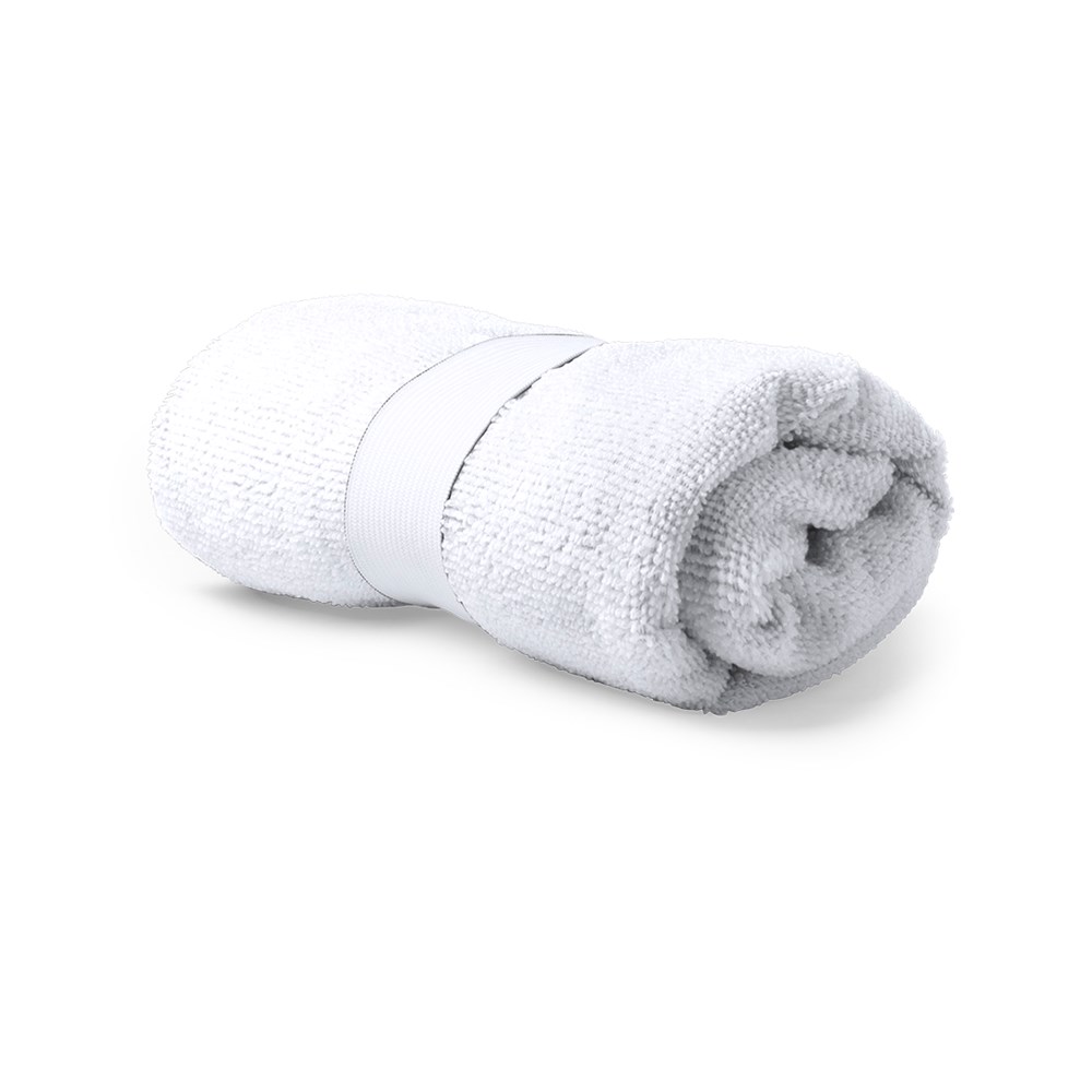 Saugfähiges Mikrofasertuch. Größe 40 x 90 cm, aus 160 g/m2 Mikrofasermaterial. Erhältlich in einer breiten Farbpalette, mit einem Gummiband in weißer Farbe zum Bedrucken.