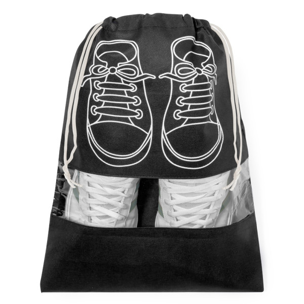 Schuhtasche aus Vlies. Praktisch zur Aufbewahrung von Schuhen und bedruckt mit einem klassischen Schuhdesign. Mit praktischem Sichtfenster und Kordelzug. Erhältlich in verschiedenen Farben und mit weißen Details.