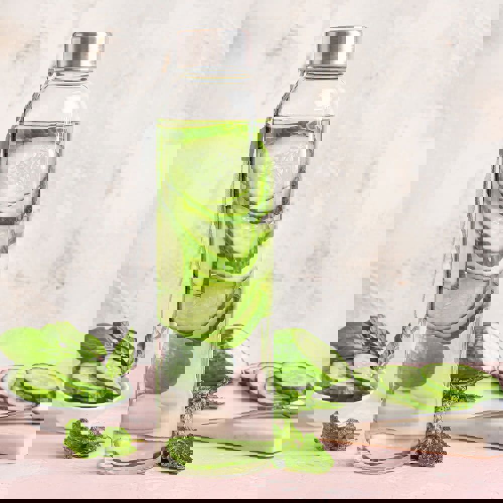 Die Wasserflasche aus Glas hat ein Fassungsvermögen von 500ml. Mit der Trageschlaufe an der Kappe, kann die Flasche bequem mitgenommen werden. Die Flasche ist für kalte, kohlensäurehaltige und stille Getränke geeignet.
