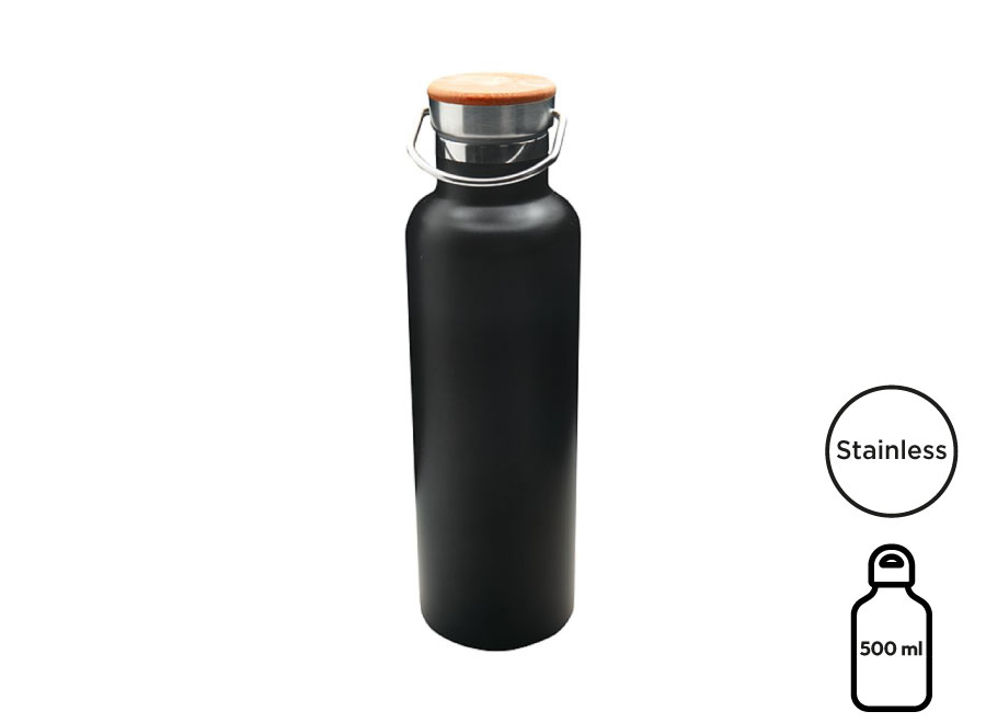 Doppelwandige Flasche 'Arima', schwarz, Bambusdeckel, 500 ml