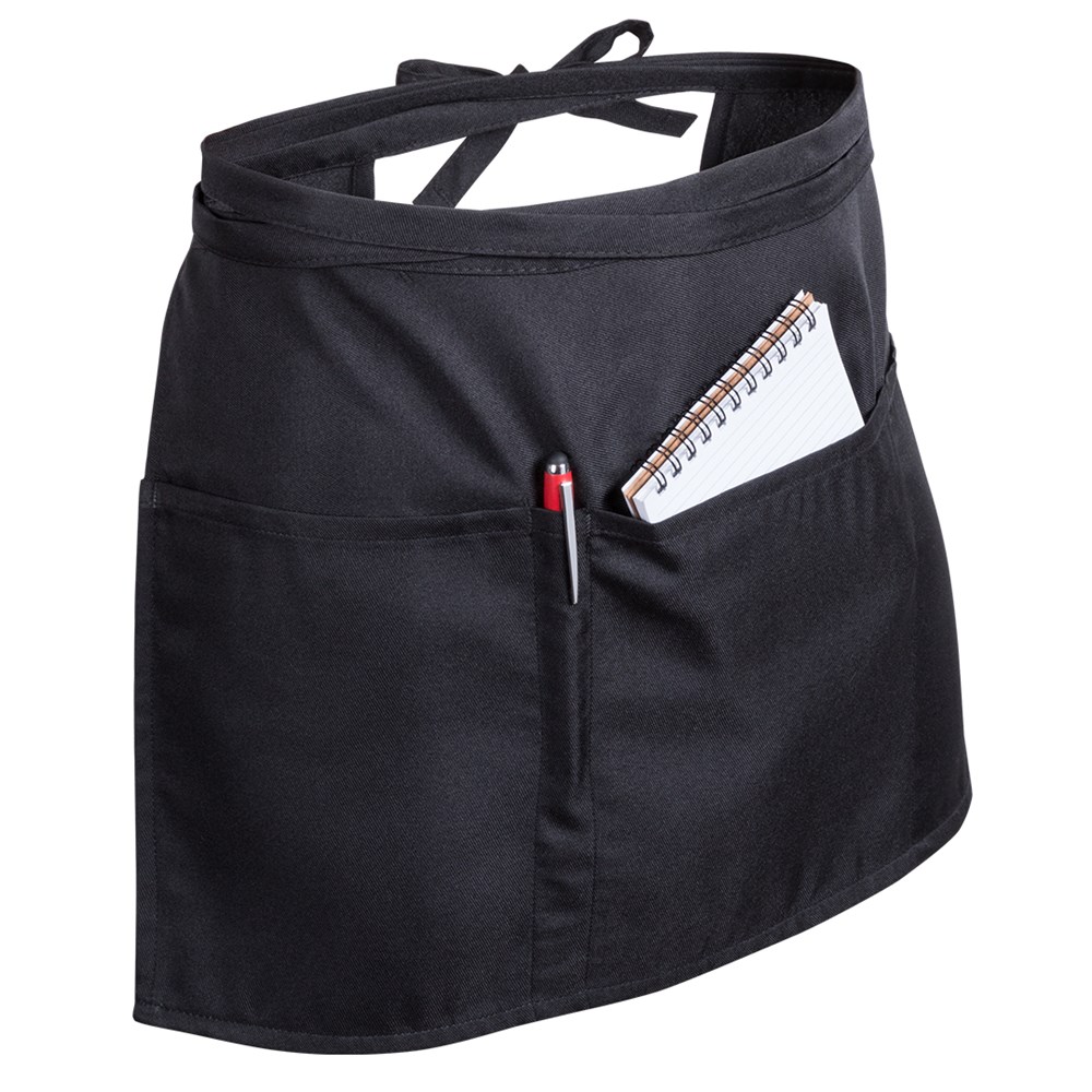 Taillen-Schürze aus 100 % Polyester in geschmeidigem, elegantem Schwarz. Mit 2 großen sowie einer mittelgroßen Tasche und einem Stifthalter. Mit Bändern zum Einstellen.