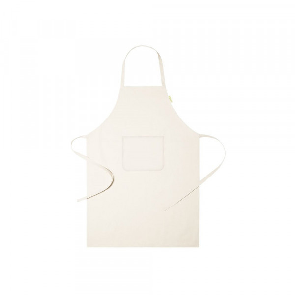Schürze aus Bio-Baumwolle, mit Fronttasche und Verstellriemen. Reicht bis zu den Knien hin. Umweltfreundliches Etikett, das die Kennzeichnung von Bio-Baumwolle auszeichnet.