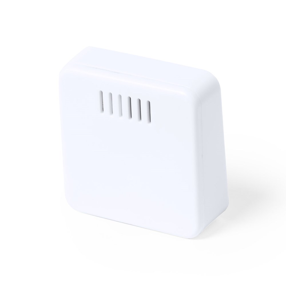 Wetterstation aus robustem ABS mit weißer Oberfläche. Gut ablesbares LCD-Display mit Thermometer und Feuchtigkeitssensor. Magnetische Befestigung und batteriebetrieben (Knopfzelle im Lieferumfang enthalten, mit Schutzfolie). Präsentiert in einer individuellen Kraftpapier-Designbox, mit Bedienungsanleitung in Englisch und Spanisch.