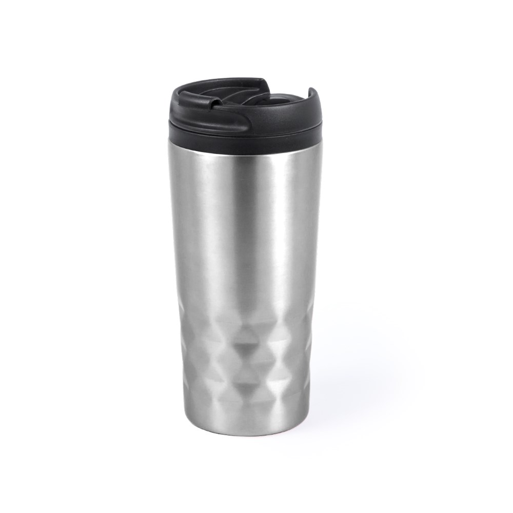 Edelstahl-Trinkbecher mit 310 ml Fassungsvermögen. Mit leicht zu öffnendem Spenderdeckel und weichem, schaumgepolstertem Boden. Es ist ideal für Ihren Schreibtisch, Tisch oder jede andere Oberfläche, auf der Sie in Ruhe Ihr Lieblingsgetränk genießen können. Mit origineller Hochglanzoberfläche und Rautendesign.