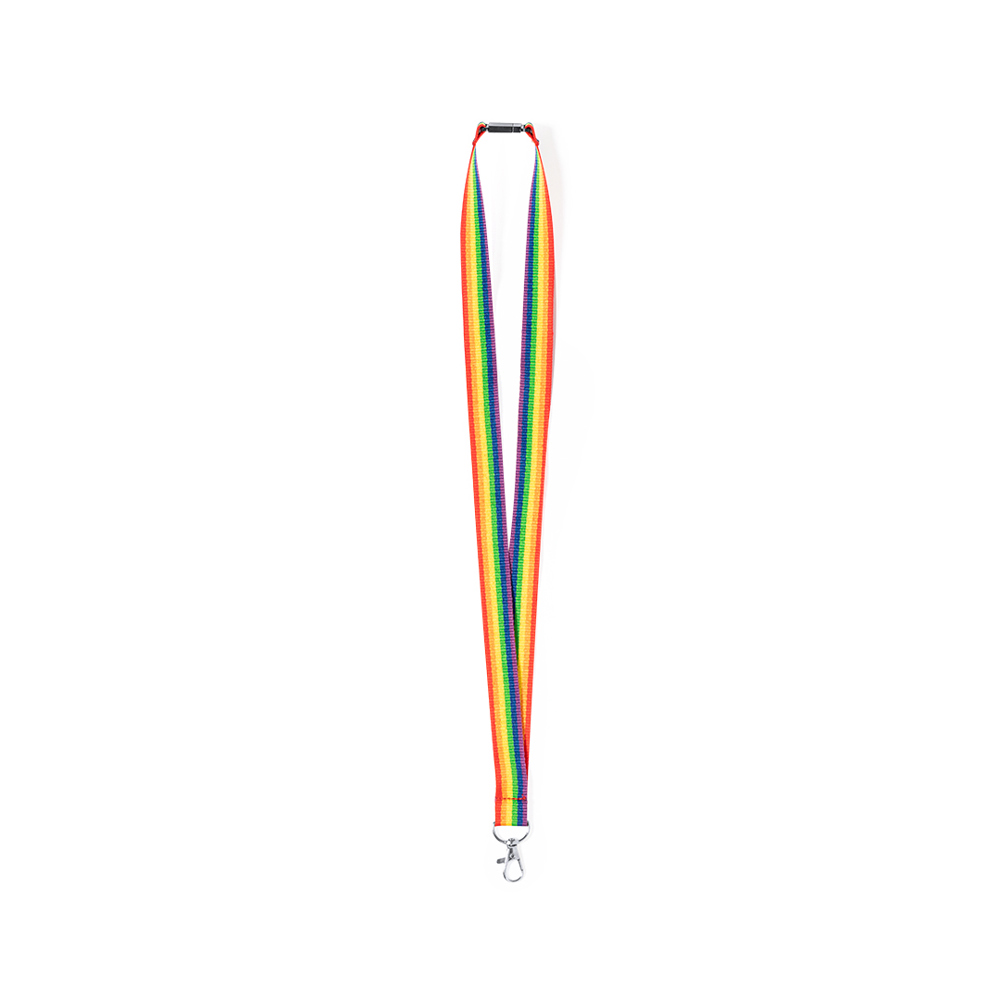 Mehrfarbiges Regenbogen-Lanyard aus weichem Polyester. Mit Drehhaken aus Metall und Nackensicherung. Ein echter Stolz des Schlüsselbandes.