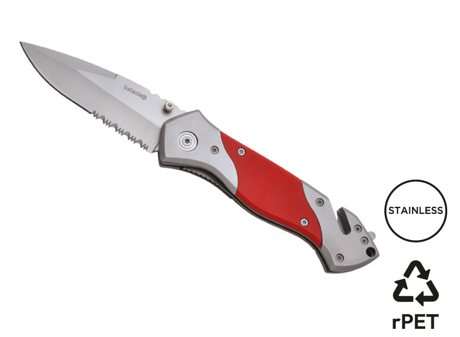 Klappbares Messer mit Klinge aus rostfreiem 420er Edelstahl, bestehend aus einem feinen Teil der Klinge (für präzise Schnitte) und einem teilweise gezahnten Teil (für schwierigere Schnitte). Montage mit Torx Schrauben. Griff aus rotem G10-Faserstoff und Edelstahl. Einhändiges Öffnen/ Schließen mit einem Liner-Lock-Sicherheitsmechanismus. Mit integrierter Gurtschneide- und Glasbrecherfunktion an den hinteren Heftbacken. Wird in einem melierten grauen Etui aus RPET geliefert.