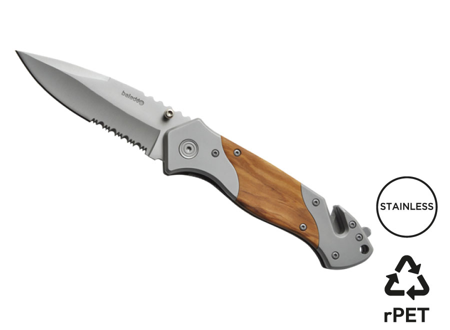 Klappbares Messer mit Klinge aus rostfreiem 420er Edelstahl, bestehend aus einem feinen Teil der Klinge (für präzise Schnitte) und einem teilweise gezahnten Teil (für schwierigere Schnitte). Montage mit Torx-Schrauben. Griff aus Olivenholz und Edelstahl. Einhändiges Öffnen/ Schließen mit einem Liner-Lock-Sicherheitsmechanismus. Mit integrierter Gurtschneide- und Glasbrecherfunktion an den hinteren Heftbacken. Wird in einem melierten grauen Etui aus RPET geliefert.