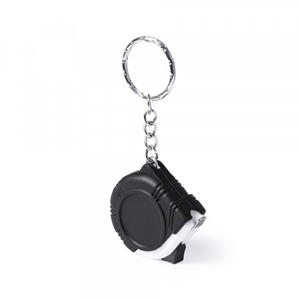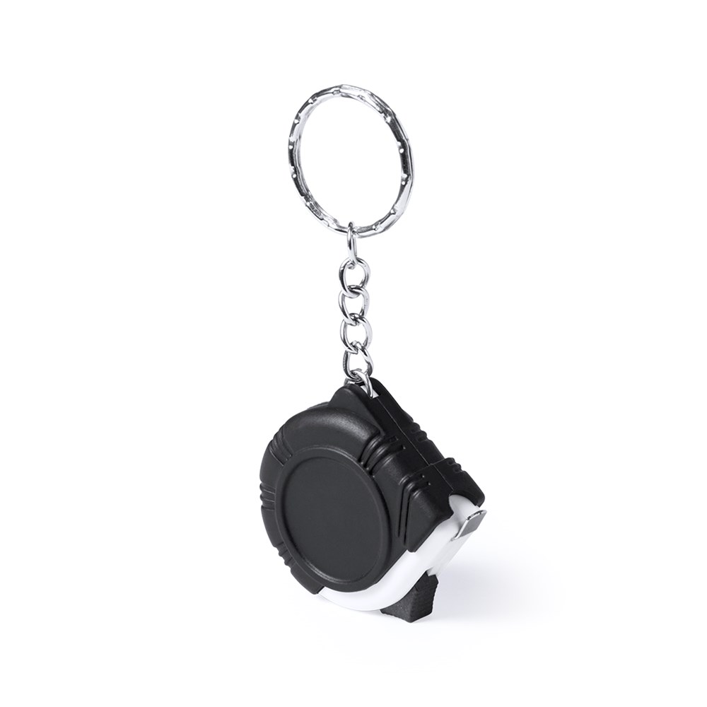 Schlüsselanhänger mit 1 m langem Metallmaßband mit Verriegelungsmechanismus. Maßangabe in Zentimeter, Zoll und Fuß. Mit spezieller Stanzung zum Bedrucken.