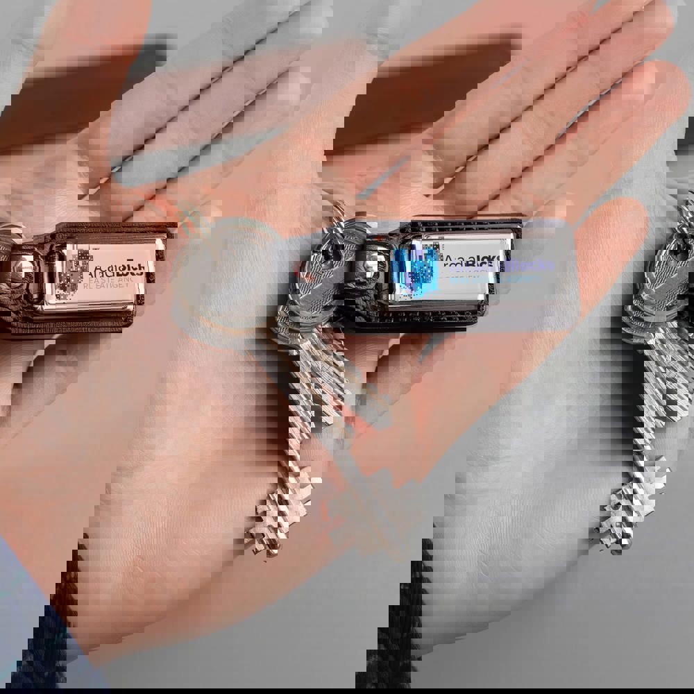 Rechteckiger Metallschlüsselanhänger mit Ring. Einseitiges Doming. mehr