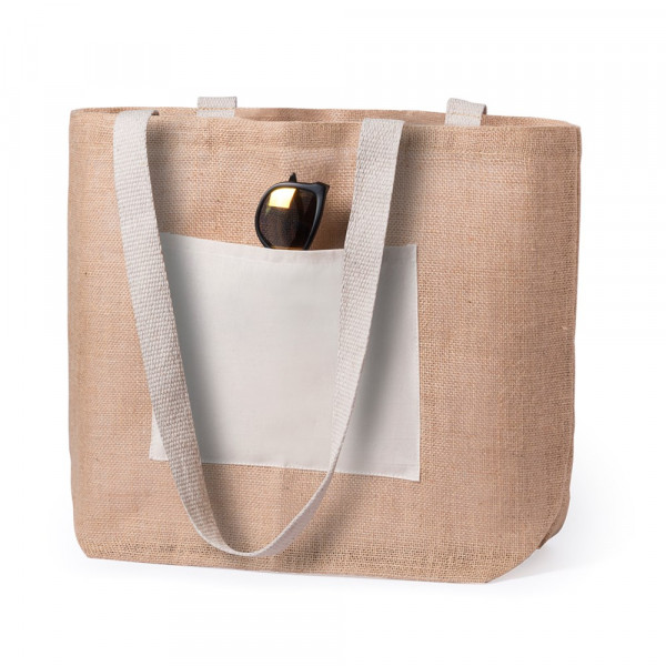 Jutetasche mit Baumwoll-Fronttasche. Mit langen, verstärkten Griffen aus Baumwolle in Weiß,... mehr