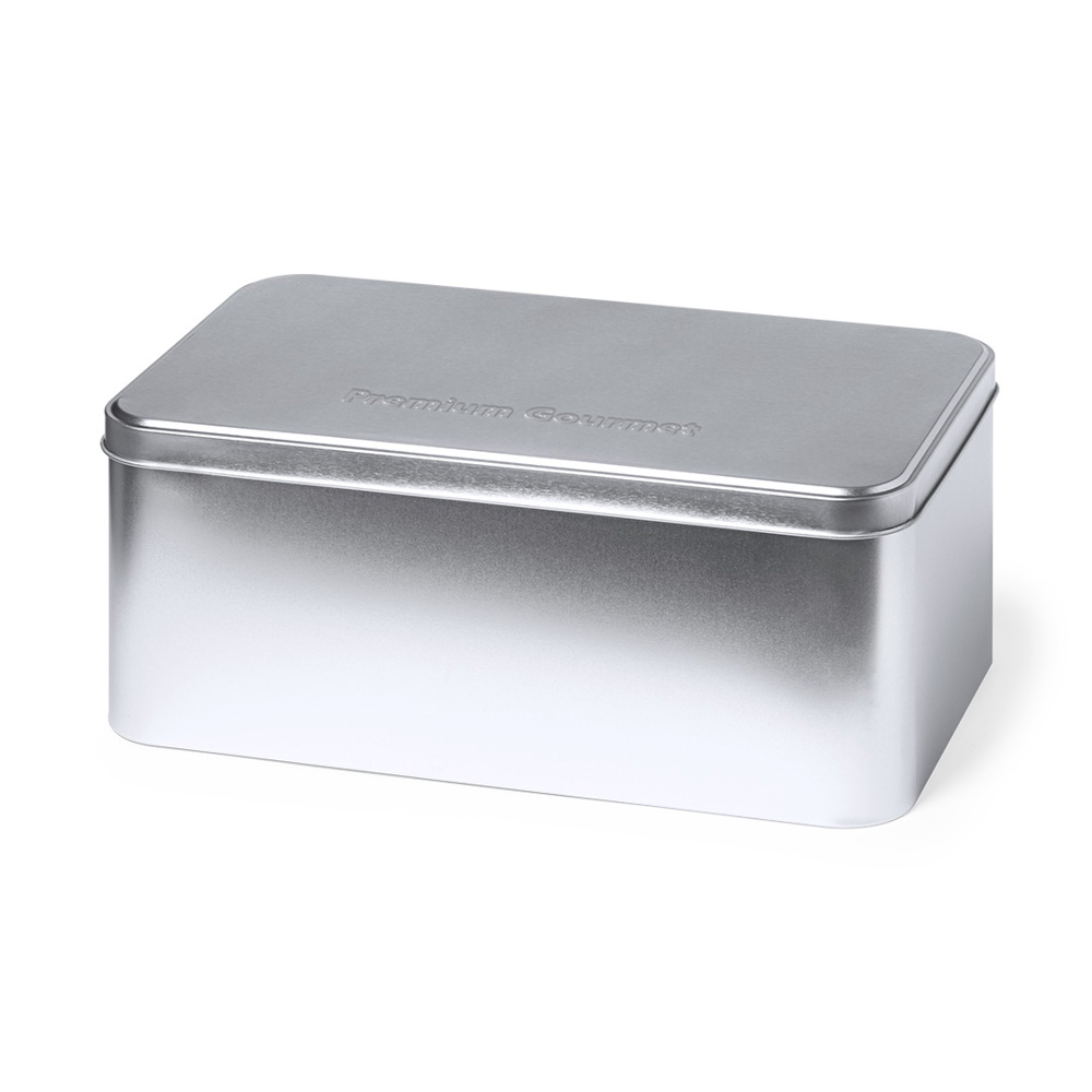 Rechteckige Präsentationsbox aus robustem, silberfarbenem Metall mit passendem Deckel.
