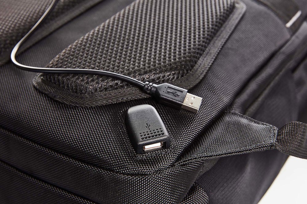 aufwändig gearbeiteter Businessrucksack mit Reflex-Besatz und LED-Fahrradlicht-Befestigungsmöglichkeit; großes Hauptfach mit 2-Wege-Reißverschluss, Notebookfach für 15" Notebooks, gepolsterter Reißverschluss-Innentasche und flacher Reißverschluss-Tasche; großes 2-Wege-Reißverschluss-Fach mit Veloursfutter, geeignet für 17" Notebook; Reißverschluss-Tasche auf der Front; seitlich zwei elastische Netzfächer, zwei versteckte Reißverschluss-Einsteckfächer; rückseitige Befestigungsschlaufe für Trolley-Gestänge, verstecktes Reißverschluss-Fach, USB-Durchlass mit integriertem Verbindungskabel; umfänglich gepolstertes Tragesystem mit abnehmbarem, verstellbarem und elastischem Brustgurt, elastischen Schlaufen für z.B. Brillenbügel, sowie elastischem Reißverschluss-Netzfach; gepolsterter Handgriff; Reißverschlusschieber (auf der Front) verfügbar in den abgebildeten Farben.