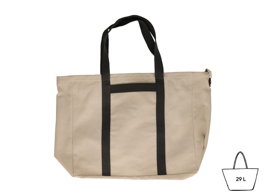 Große, elegante und robuste Tasche aus 100 % Baumwoll-Canvas von 454 g/m² mit Reißverschluss. Verstärkte und eingefasste Überlappungsnähte. Drei Innentaschen und eine Außentasche. Abnehmbare Innentasche mit Reißverschluss dank Metallkarabiner. 145 g/m² bedrucktes Futter. Griffe und abnehmbarer Schultergurt aus Baumwollköper. Cleverer Tragehalt auf Rückseite der Tasche, der speziell für den Transport einer Sportmatte, einer Jacke usw. entwickelt wurde, ohne den Innenraum der Tasche zu beanspruchen. Fassungsvermögen: 29 L.