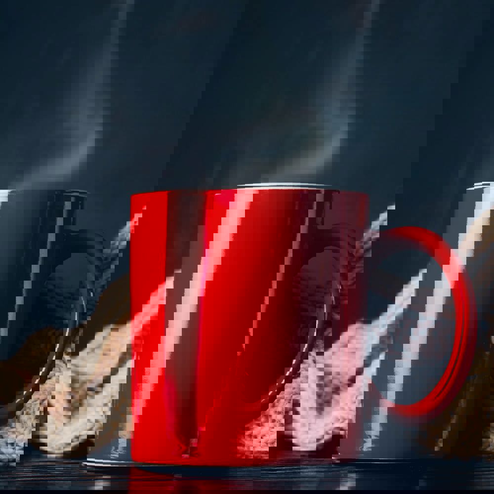 Hellroter gerader Keramikbecher mit weißer Innenseite. Große Druckfläche. mehr