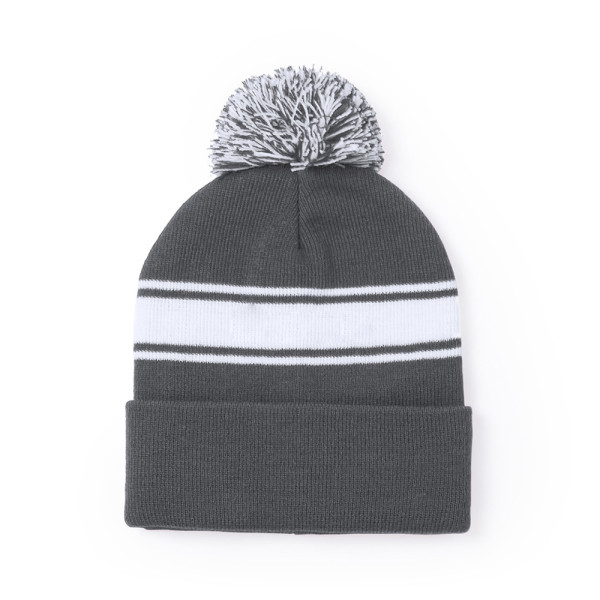 Weiche und warme Mütze aus Acryl in einer Vielzahl von Farben. Mit originellem Design, weißem Streifen und farblich passendem, zweifarbigem Bommel.