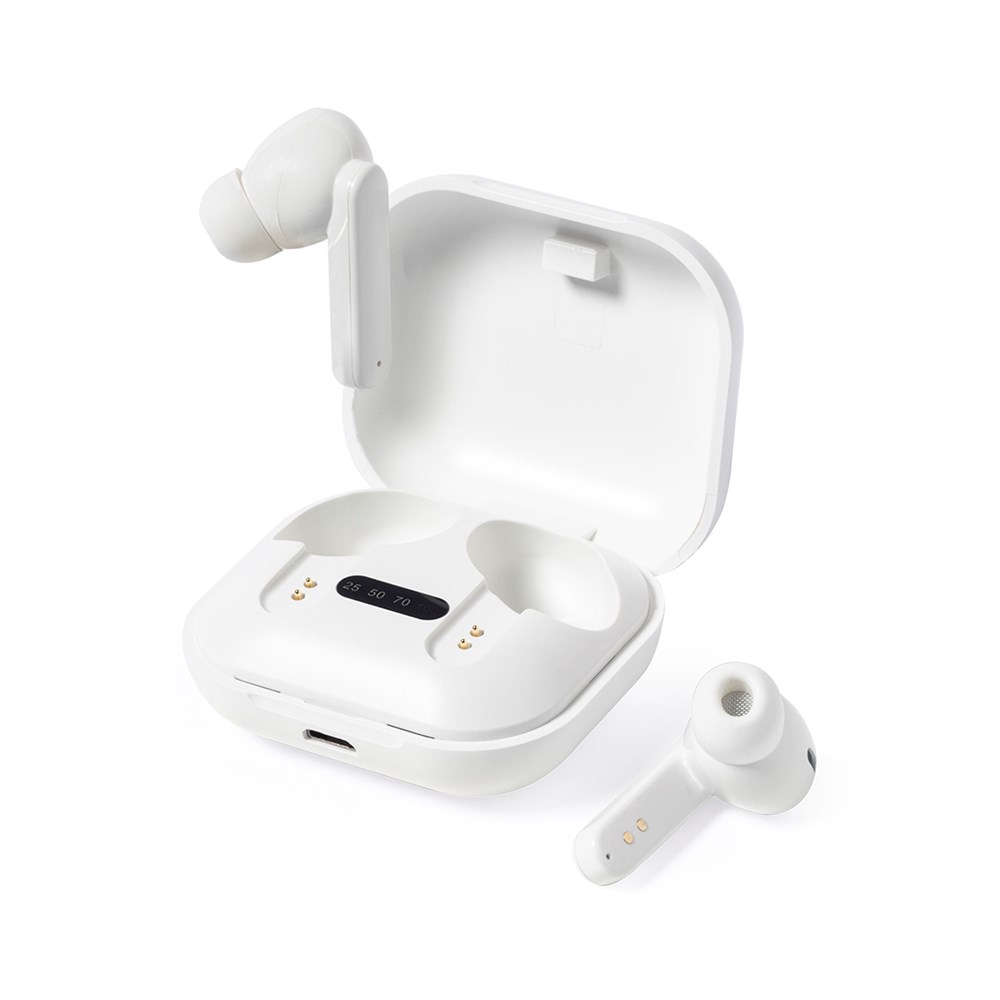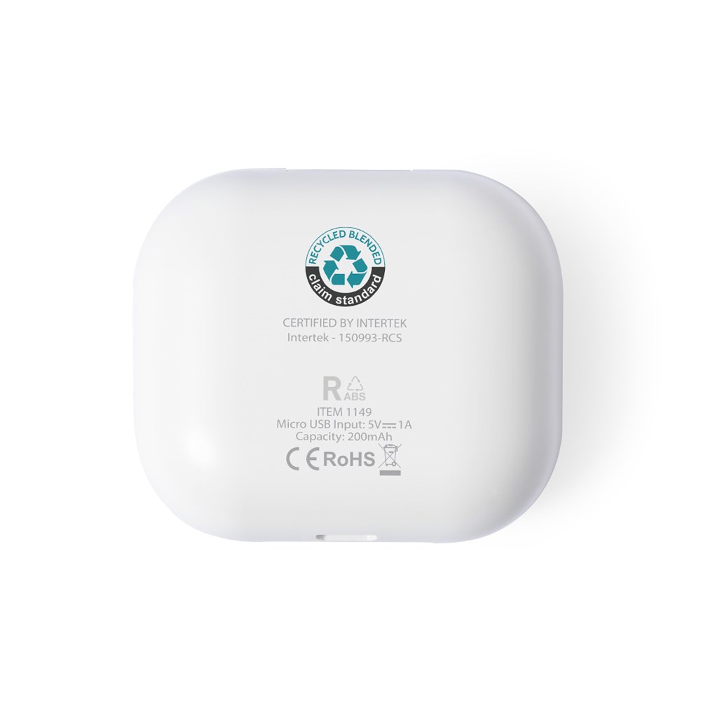 In-Ear-Kopfhörer der Nature-Line und Bluetooth® 5.0-Anbindung, mit Lithium-Akku und in edlem weißen Finish. Hergestellt aus recyceltem ABS (RABS) und RCS-zertifiziert, was seine recycelte Herkunft garantiert. Sie sind ergonomisch gestaltet und verfügen über einen in das Headset integrierten Bedienknopf mit passender Ladestation und LED-Ladezustandsanzeige. Freisprech- und wiederaufladbare Funktion mit mitgeliefertem Micro-USB-Kabel. Präsentiert in einer attraktiven Öko-Designbox.