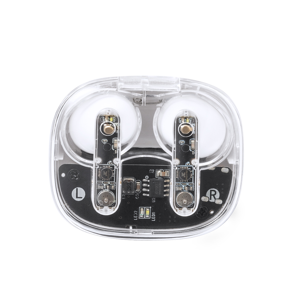 In-Ear-Kopfhörer in markantem, transparentem Design. Bluetooth® 5.3-Verbindung und lange Akkulaufzeit. Ergonomisches Design, mit integrierter Touch-Control-Taste am Headset, passender Ladestation und Ladestatusanzeige. Freisprechfunktion. Ladeanschluss mit Typ-C-Eingang (Kabel im Lieferumfang enthalten). Präsentiert in individueller Kraft-Design-Box und recycelter Tasche.