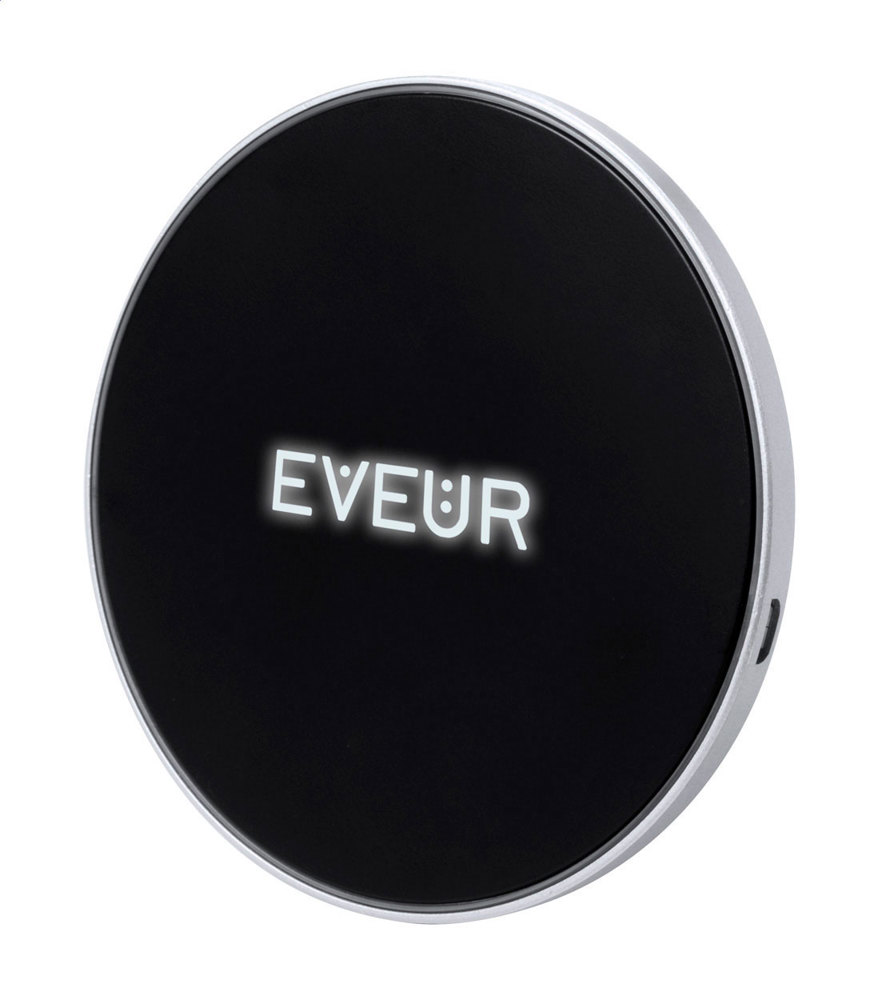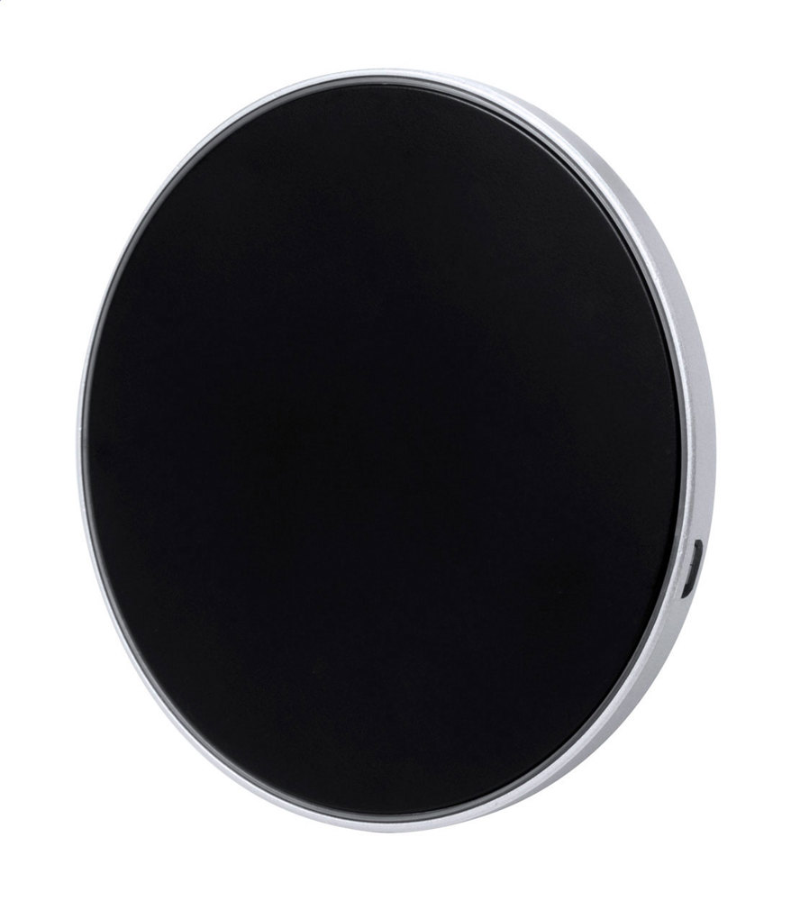 Wireless-Charger (5 W) mit Kunststoffgehäuse und innenliegender LED für eine unterleuchtete Gravur. Inkl. USB-Ladekabel.