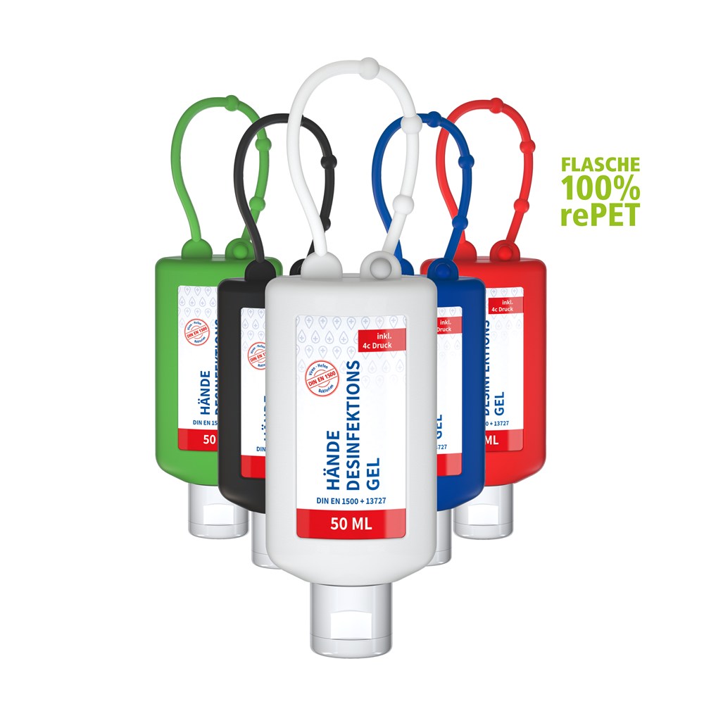 50 ml Flasche aus 100% recyceltem PET, transparent mit leichter R-PET-Färbung. Mit Klappdeckel "weiß" aus recyceltem PP, zufällig ausgerichtet; Silikonhülle und Schlaufe in blau. Nachfüllbar.