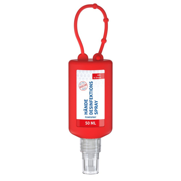 50 ml Flasche aus 100% recyceltem PET, transparent mit leichter R-PET-Färbung. Mit Pumpaufsatz "transparent" mit Schutzkappe; Silikonhülle und Schlaufe in blau. Nachfüllbar.