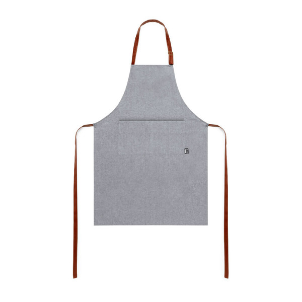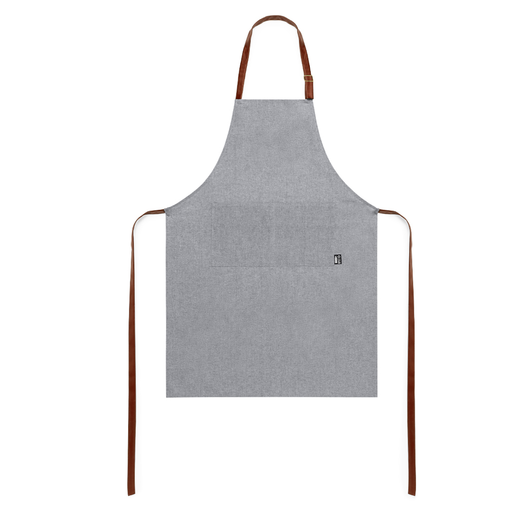 Linie Natur Schürze aus RPET-Material, das aus recyceltem Kunststoff hergestellt wird, um die Wiederverwendung von Kunststoffabfällen zu fördern und die Nachhaltigkeit des Planeten zu unterstützen. Unterhalb des Knies geschnitten, mit Verstellriemen aus widerstandsfähigem Lederimitat und großer Fronttasche. Etikett auf der Tasche mit RPET-Symbol.