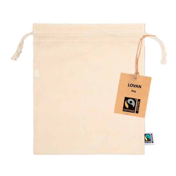 Natur Linie Tasche, hergestellt aus Baumwolle 105g/m2 in natürlicher Farbe. Mit der Fairtrade-Zertifizierung (Fair Trade) ein solidarisches und alternatives Handelssystem, das die Entwicklung der Völker und die Bekämpfung der Armut zum Ziel hat. Genäht, mit selbstschließender Schnur. Einschließlich Fairtrade-Label und unverwechselbarem Hangtag aus recyceltem Karton.